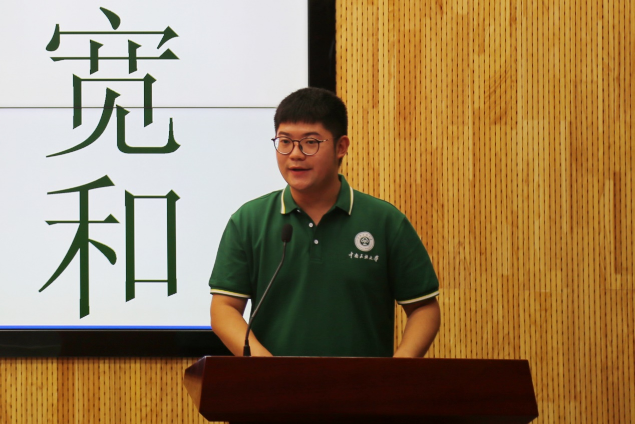 研究生新生代表付成栋从“文传人”、“民大人”、“青年人”三个角度出发,分享自己四年大学生活的经历和思考,与新生共勉。他认为新时代大学生不仅要学会做事、做人,还要勇于承担社会责任,提升综合素质,实现自我价值。