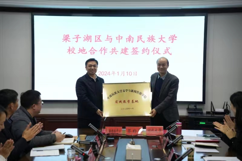 (通讯员:田园子,摄影:陈俊杰)2024年1月10日上午,学院会同湖北大学新闻传播学院与梁子湖区融媒体中心签订战略合作协议,正式成立共建共享的实践教学基地,探索新型新闻传播人才培养“校-校-地”共建新模式。学院院长陶喜红、新闻学教研室郝永华主任、田园子副教授出席签约仪式。梁子湖区副区长主持签约仪式。