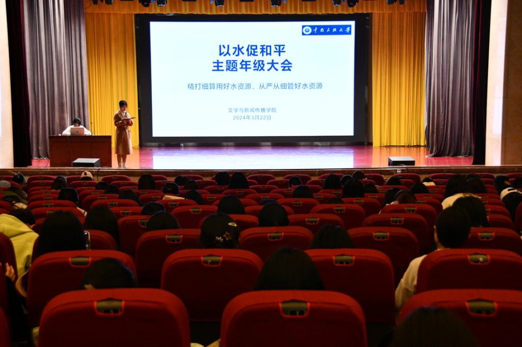 本站讯(通讯员朱雨濛摄影周锦诗赵欣怡)2024年的3月22日是第三十二届世界节水日,3月22日—28日为第三十七届“中国水周”。为提高学生的节水意识,加强水资源保护,我院于3月22日上午在学术会堂召开“以水促和平”主题年级大会。会议由2023级新闻传播学类辅导员韩婷老师主持,2023级全体学生参加。